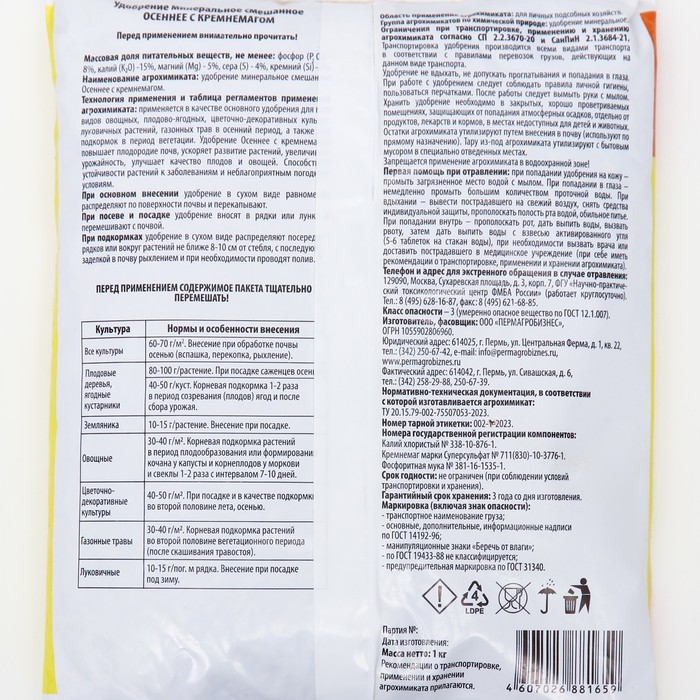 Осеннее удобрение с кремнемагом станет отличным подспорьем для вашего сада и огорода. Этот минеральный состав в виде сухой смеси идеально подходит для повышения урожайности культур, особенно таких, как тыква. Оно содержит калий, магний, серу и фосфор, обеспечивая растения всем необходимым для роста и развития на протяжении весны и лета.