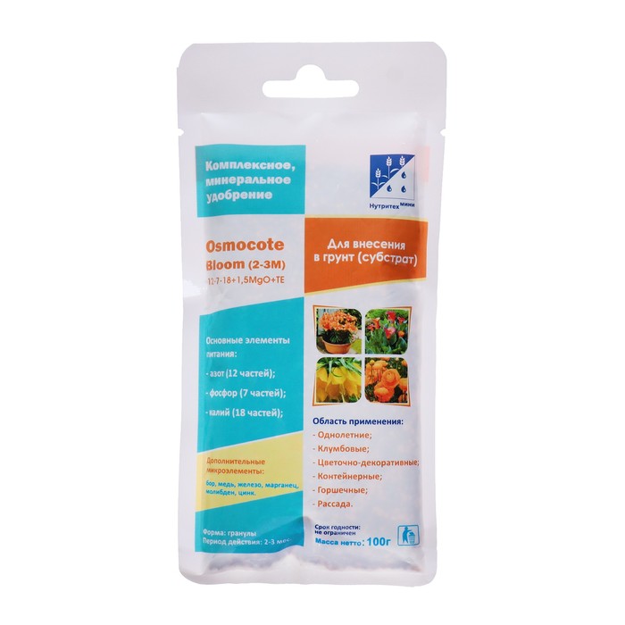 Bloom преимущественно разрабатывался для клумбовых растений, таких как петуния, бегония, герань. Благодаря маленькой грануле легко смешивается с субстратом, в том числе удобен для удобрения газонов.