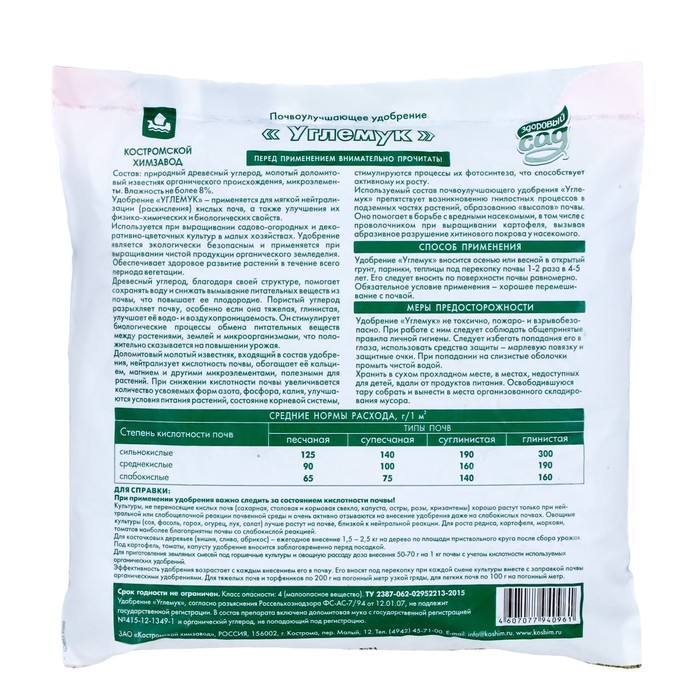 Углемук от торговой марки Здоровый сад поставляется в удобной упаковке весом 2 кг. Это позволяет использовать его на больших площадях, а также делать точечные подкормки отдельных растений. Продукт имеет простую инструкцию по применению, что делает его доступным для использования как для профессиональных садоводов, так и для начинающих огородников.