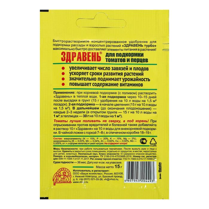Содержит: макроэлементы азот 15%, фосфор 20%, калий 15%, магний 2%, гумат натрия 2%; микроэлементы бор 0,03%, марганец 0,04%, цинк 0,02%, медь 0,02%, молибден 0,005%, в т. ч. в форме хелатов. Не содержит хлора!