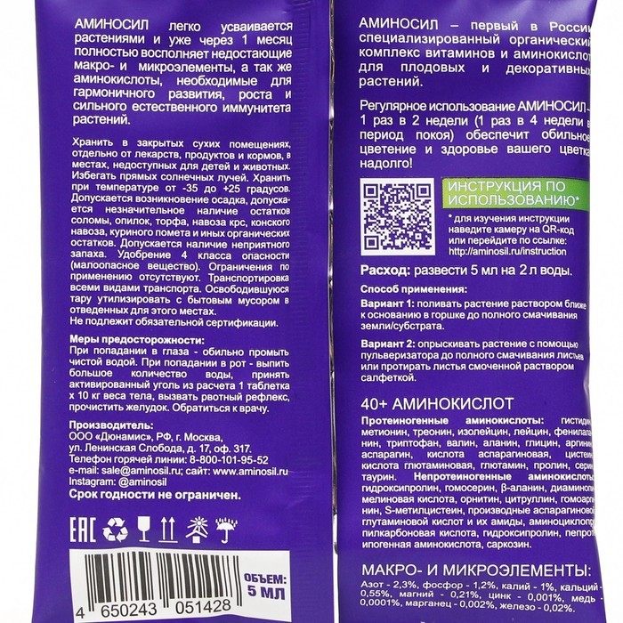 Полный комплекс витаминов для орхидей создан для полноценного сбалансированного питания всех типов орхидей. Подкормка для орхидей , 100% органический состав.Благодаря микро и макро-элементам органического происхождения Аминосил дарит орхидеям длительное и интенсивное цветение, а так же обеспечивает качественный рост и развитие растения.Удобрение для цветов Аминосил принимают активное участие в процессе метаболизма растений. По сути, они представляют собой элементы или кирпичики, благодаря которыми происходит строительство растительных клеток.Перед удобрением полейте культуру обессоленной (кипяченой или фильтрованной) водой.Расход: 5 мл АМИНОСИЛ разбавить в 2 л воды до образования однородного раствора.Вариант 1: поливать растение получившимся раствором ближе к основанию в горшке до полного намокания субстрата/грунта и корней.Вариант 2: опрыскивать растение получившимся раствором до полного смачивания листьев или протирать листья смоченной раствором салфеткой. Избегать попадания на бутоны и лепестки цветов.Периодичность: подкармливать растения 1 раз в 2 недели в активный период и 1 раз в 4 недели в период покоя.Регулярное использование АМИНОСИЛ обеспечит обильное цветение и здоровье вашего цветка надолго!Важно: нельзя поливать растения слитой подкормкой повторно, раствор изменяет свои свойства и может содержать вымытые грибки и болезни.Насыщает растение, субстрат и почву всеми необходимыми витаминами;Укрепляет здоровье и иммунитет растения.