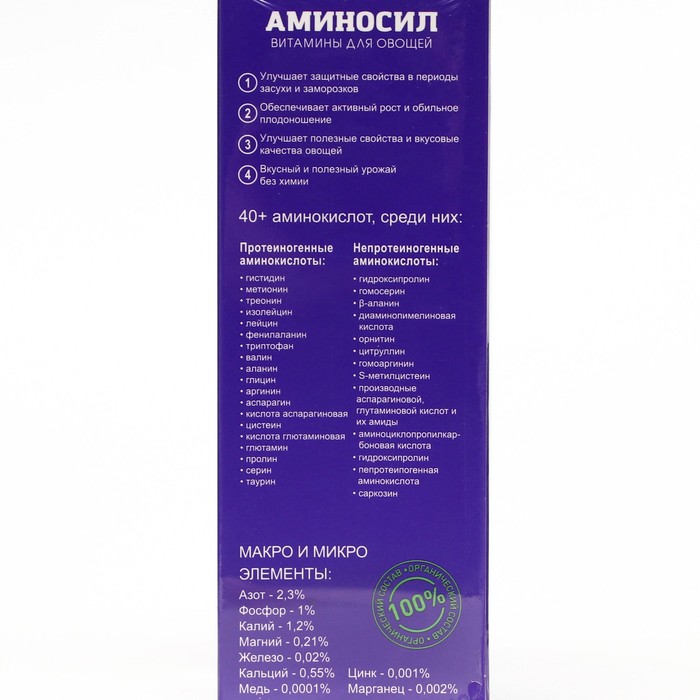Полный комплекс витаминов. 100% органический состав. Идеально подходит для ухода, питания и удобрения всех видов овощей. Улучшает защитные свойства в периоды засухи и заморозков. Обеспечивает активный рост и обильное плодоношение. Улучшает полезные свойства и вкусовые качества овощей. Вкусный и полезный урожай без химии! Безопасен для людей и животных.
