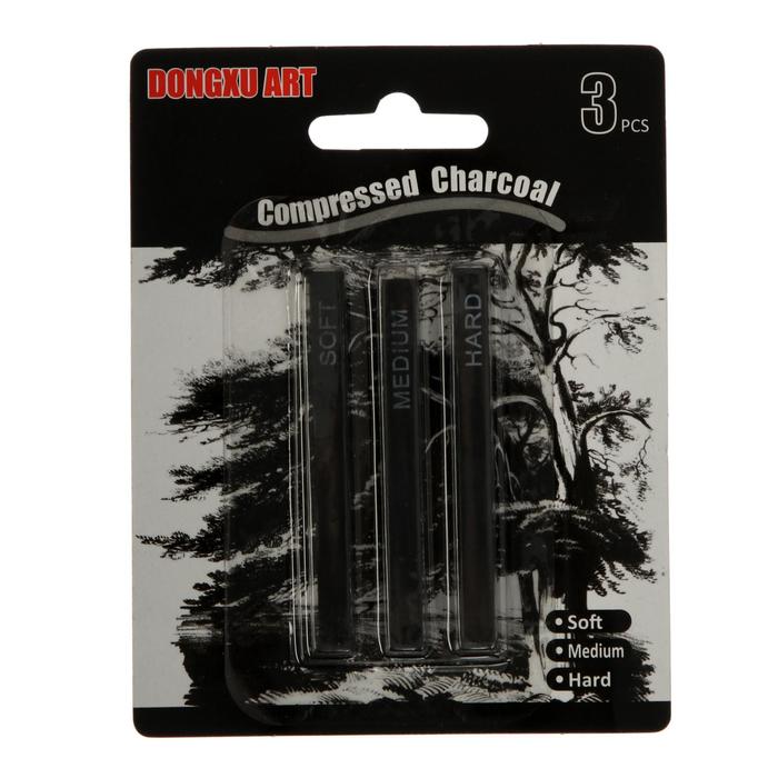 Уголь прессованный для рисования, чёрный, 3 штуки в наборе (1 шт. - мягкий, 1 шт. - средний, 1 шт. - твердый)