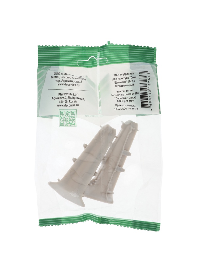 Угол внутренний для плинтуса 70мм "Деконика" (2шт. во флоупаке), 002 Светло-серый