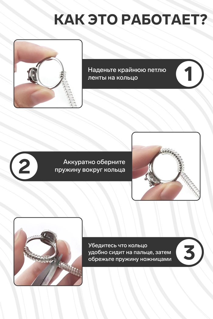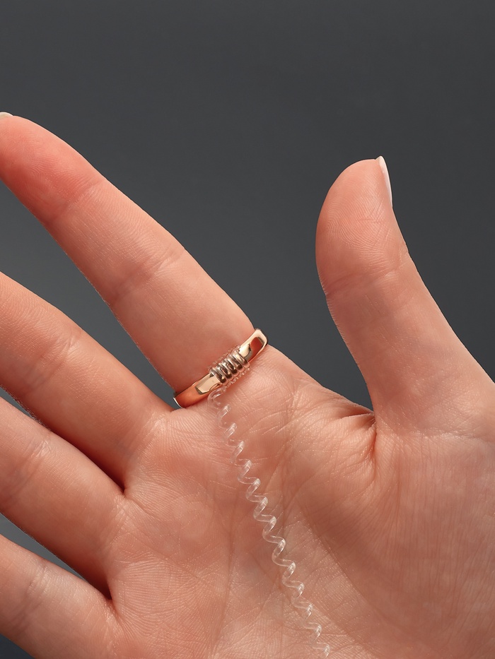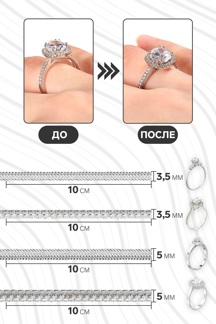 Уменьшитель размера кольца (набор из 4 штук по 10 см) — практичное решение для корректировки размера колец. В набор входят два типа уменьшителей: 3,5*100 мм и 5*100 мм, которые подойдут для различных диаметров колец. Прозрачный цвет делает их незаметными на кольце, сохраняя внешний вид украшения.