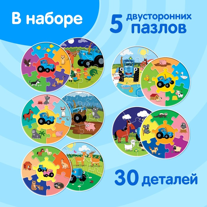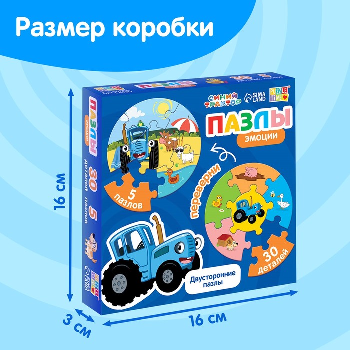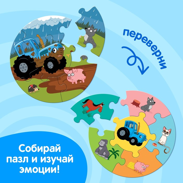 Сборка пазлов помогает развивать мелкую моторику, внимание и логическое мышление. Двусторонние элементы с эмоциями персонажей учат детей распознавать и понимать чувства, что способствует развитию эмоционального интеллекта. Яркие изображения с персонажами мультфильма «Синий трактор» делают игру ещё более увлекательной.