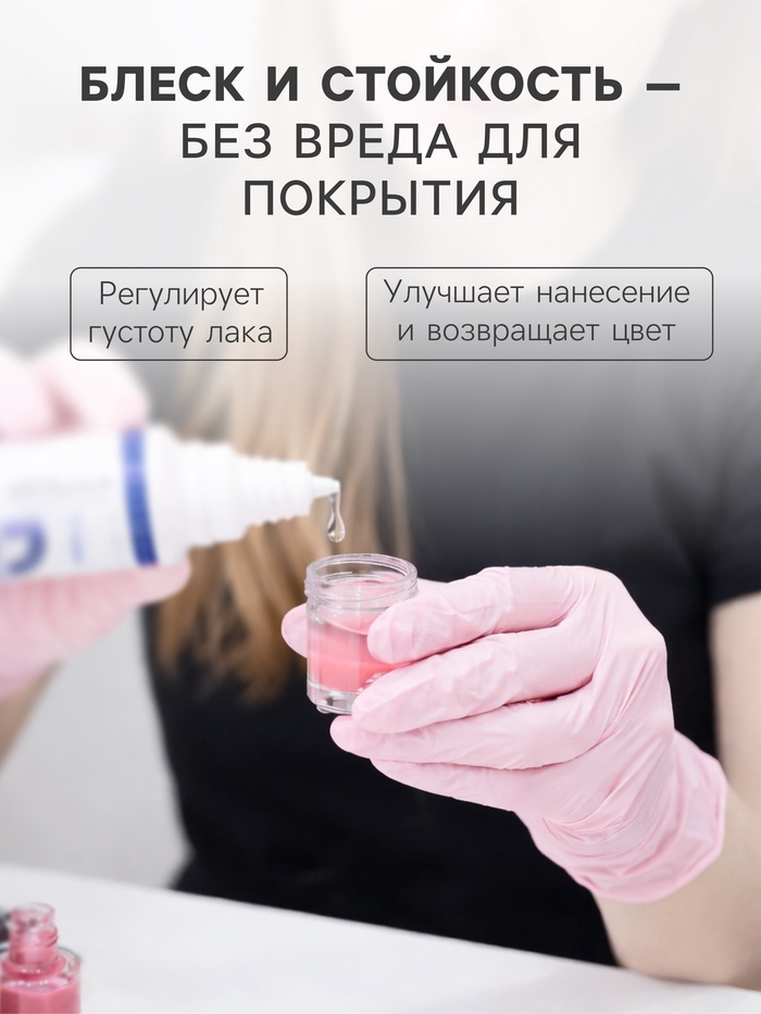 Способ применения: добавьте необходимое количество разбавителя во флакон с загустевшим лаком или топом. Аккуратно встряхните флакон до получения однородной массы и оставьте на 30 секунд.