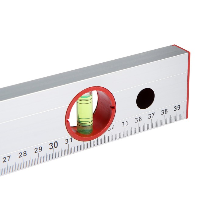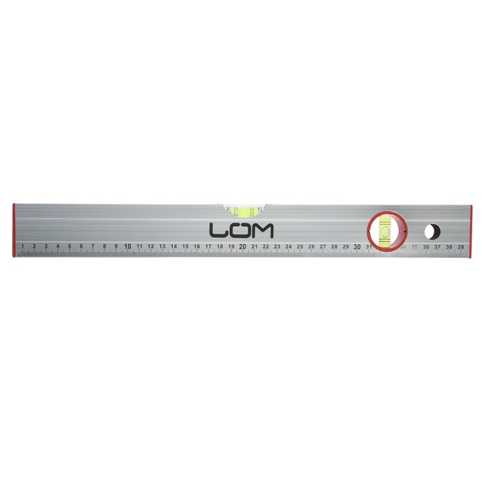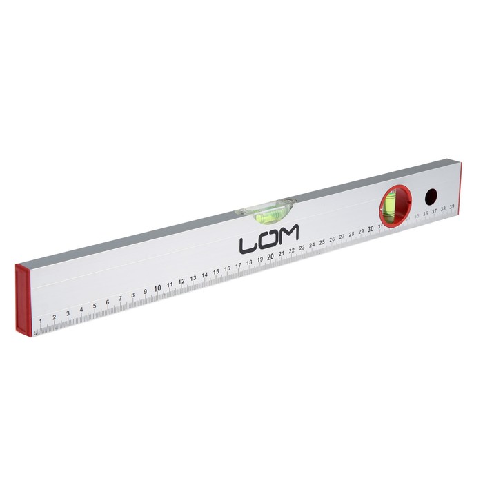 Уровень ЛОМ выполнен из прочного алюминиевого профиля прямоугольной формы. Инструмент оснащён пластмассовыми заглушками на обоих концах. Модель имеет 2 мерительных глазка для проверки отклонений по горизонтали и вертикали.