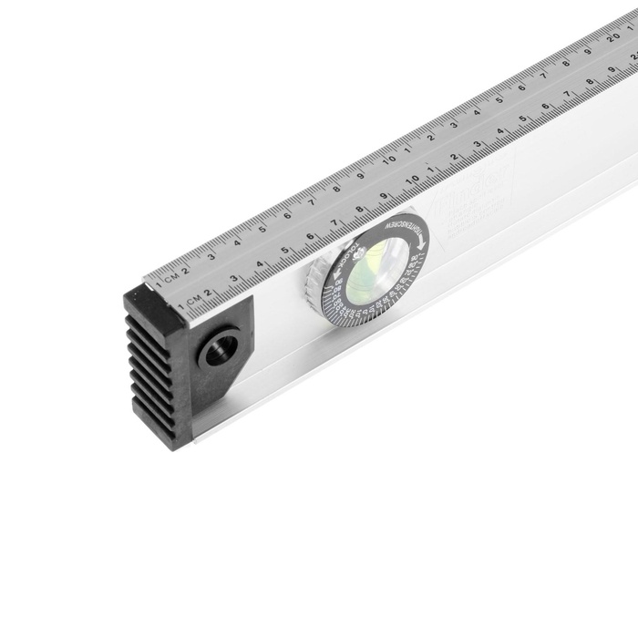 Изделие выполнено из алюминия, поэтому имеет небольшой вес. Поворотный глазок позволяет измерять угол наклона поверхности от 0 до 90°. Пластиковые заглушки защищают профиль от ударов при падении.