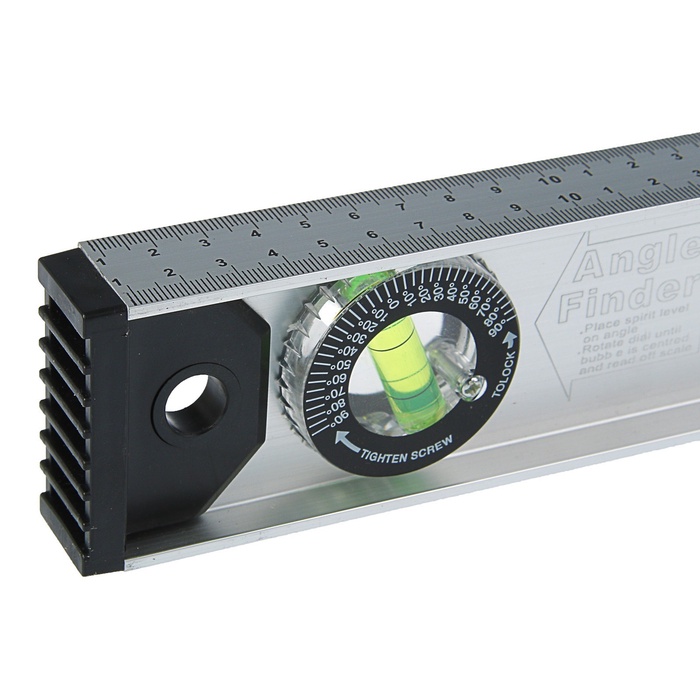 Изделие выполнено из алюминия, поэтому имеет небольшой вес. Поворотный глазок позволяет измерять угол наклона поверхности от 0 до 90°. Пластиковые заглушки защищают профиль от ударов при падении.