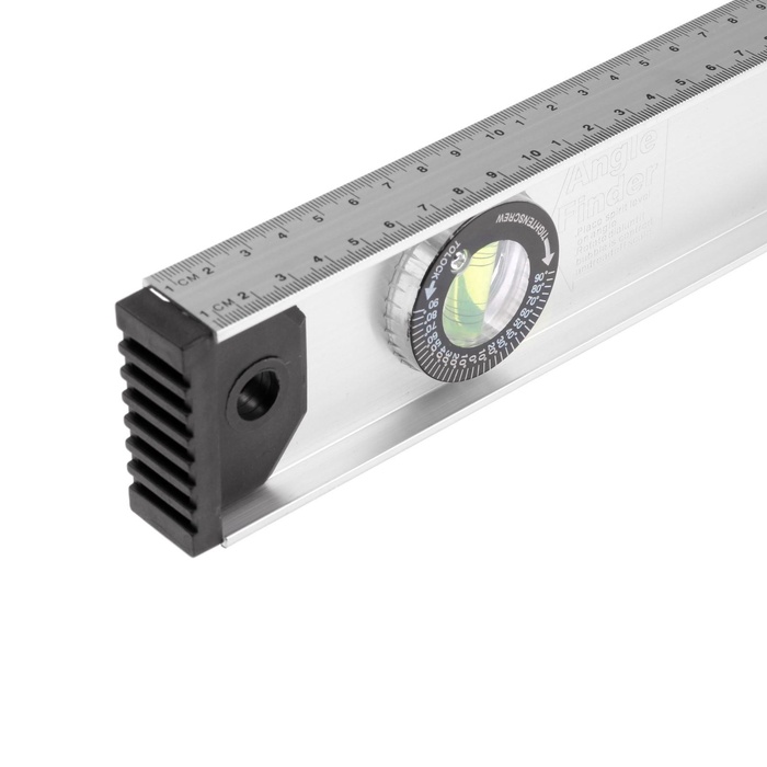 Изделие выполнено из алюминия, поэтому имеет небольшой вес. Поворотный глазок позволяет измерять угол наклона поверхности от 0 до 90°. Пластиковые заглушки защищают профиль от ударов при падении.