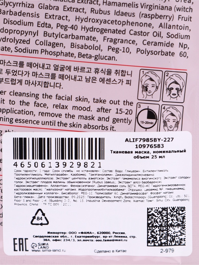 Успокаивающая маска для лица Sadoer "Малина", 25 мл