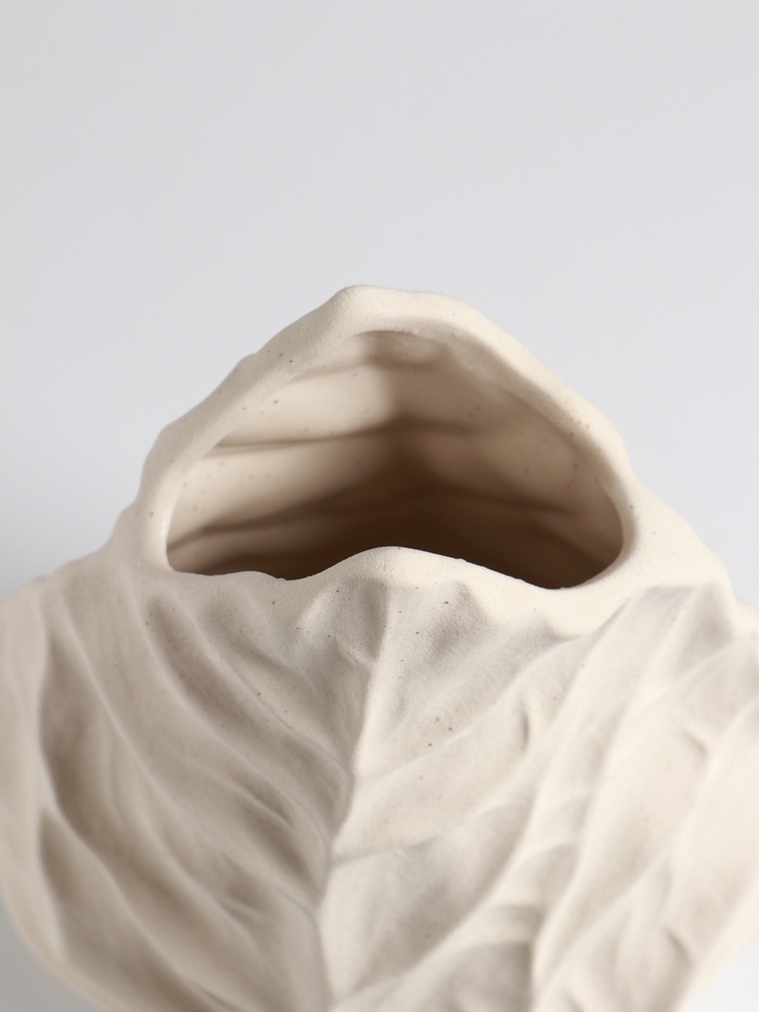 Скульптурная элегантность для вашего интерьера. Керамическая ваза бежевого цвета — это не просто сосуд для цветов, а самодостаточный арт-объект. Её форма, напоминающая мягкие складки ткани, придает статичному предмету динамику и пластику.