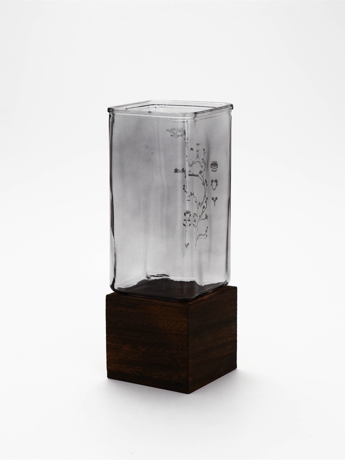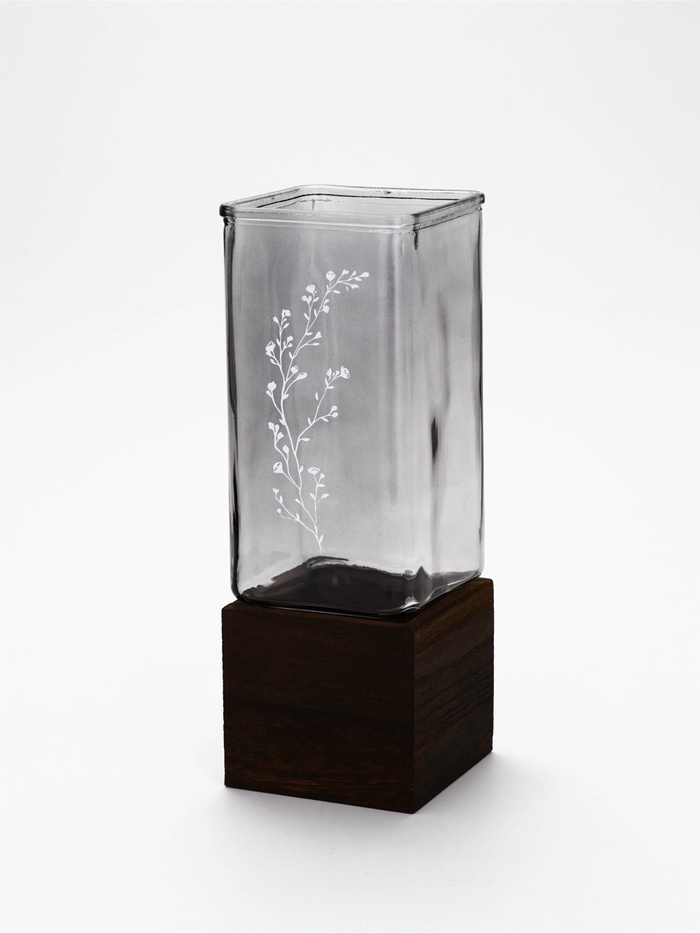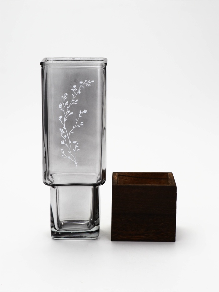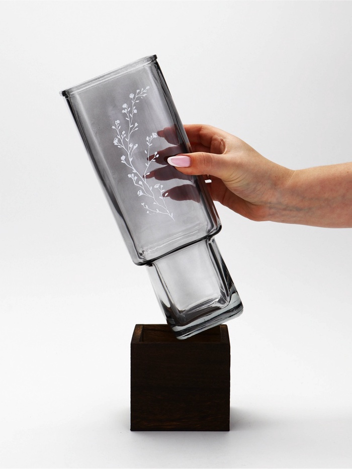 Ваза для цветов стеклянная с деревянной подставкой из темного стекла, 25 х 9 см