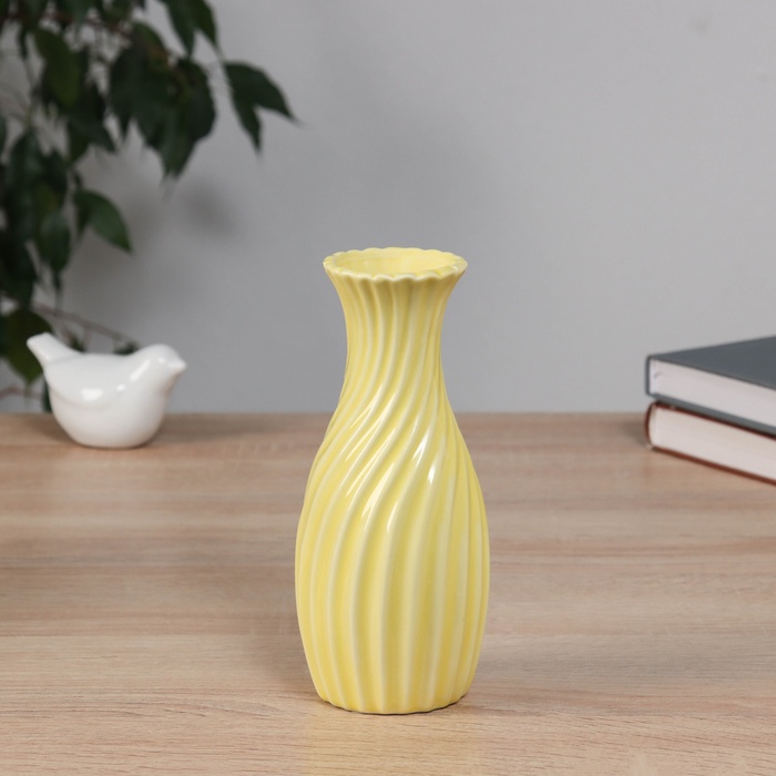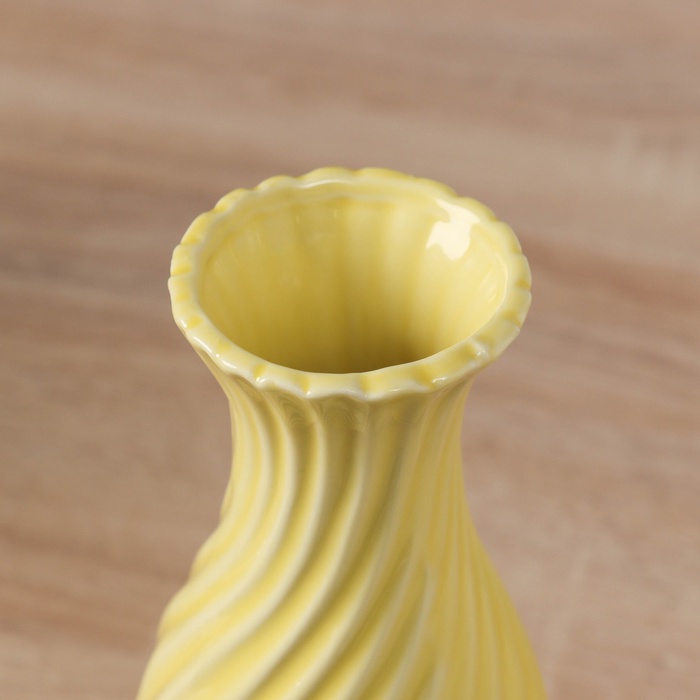 Стильная настольная ваза станет ярким акцентом в вашем интерьере. С её солнечным жёлтым цветом и рельефным оформлением, она привнесёт тепло и радость в любое пространство, будь то дом или офис.