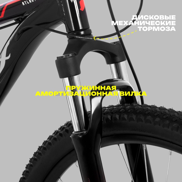 Горный велосипед подходит для передвижения по улицам города и бездорожью. Изделие оснащено дисковыми тормозами, которые обеспечивают надёжное и безопасное торможение в любых условиях. На передней части велосипеда есть амортизационная вилка для комфортной езды по неровной дороге.
