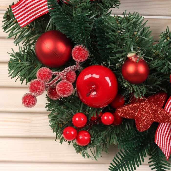 Новогодний венок диаметром 33 см в красных тонах с декоративными яблоками, шарами и ягодами. Декор в стиле барокко и фьюжн создаёт выразительный акцент для оформления дверей и стен в праздничный сезон.