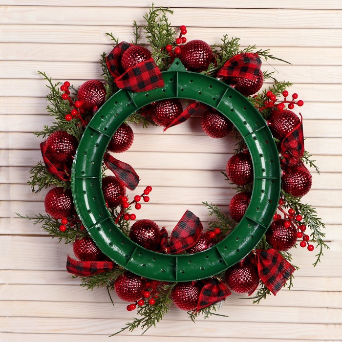 - Форма — венок, универсальный элемент для размещения на двери, стене или рядом с ёлкой.