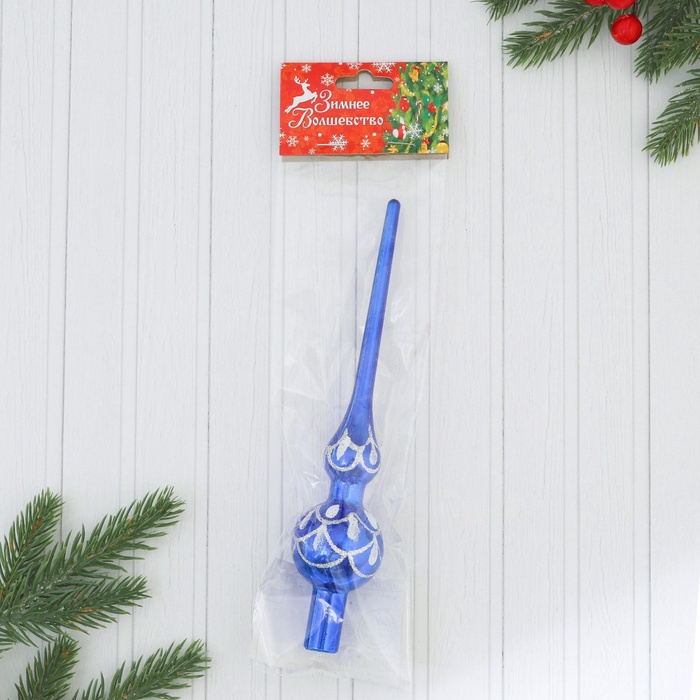 Этот верхушечный элемент выступает как центральная деталь, объединяющая все украшения на ёлке и создающая завершённый образ. Его голубой цвет напоминает о зимнем небе и морозном воздухе, придавая интерьеру лёгкость и свежесть. Изящные узоры оживляют поверхность, добавляя глубину и текстуру, что делает декор заметным и запоминающимся.
