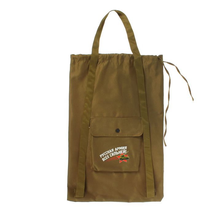 Вещмешок «Русская армия всех сильней!» дополнит образ бравого солдата. В составе тематического костюма он отлично подойдёт для 23 Февраля, Дня Победы — любого военного праздника, а также для участия в представлениях и театральных постановках.