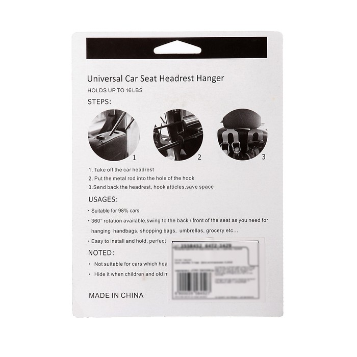 Крючок-держатель в подголовник автомобиля из 2 шт. помогут навести порядок в вашем любимом автомобиле. Удержат Ваши личные вещи от падения и валяния на полу, предотвращая их загрязнения и порчи. Крючки удобны в эксплуатации и легко монтируются в подголовники.