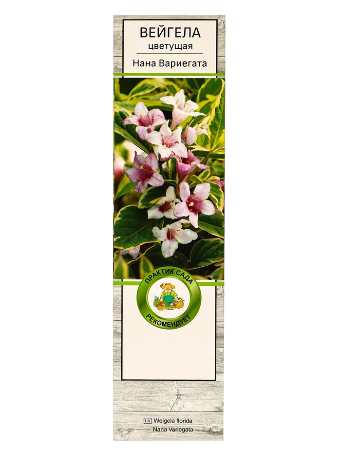 Вейгела цветущая Нана Вариегата — компактный кустарник высотой и шириной до 1,2 м. Отличительная черта сорта — пестрые листья с бело-зеленой окраской, которые создают яркий контраст с розово-красными воронковидными цветками. Цветение обильное, приходится на май-июнь, с возможной второй волной в августе. Растение сохраняет декоративность весь сезон благодаря уникальной листве. Идеально для небольших садов, миксбордеров, бордюров и выращивания в контейнерах.