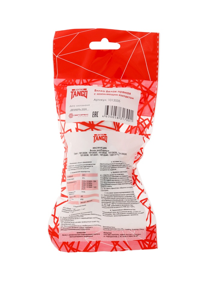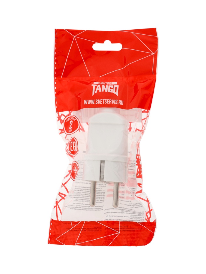 Вилка прямая TANGO, 16 А, 250 В, IP 20, с заземлением, белая, индивидуальная упаковка