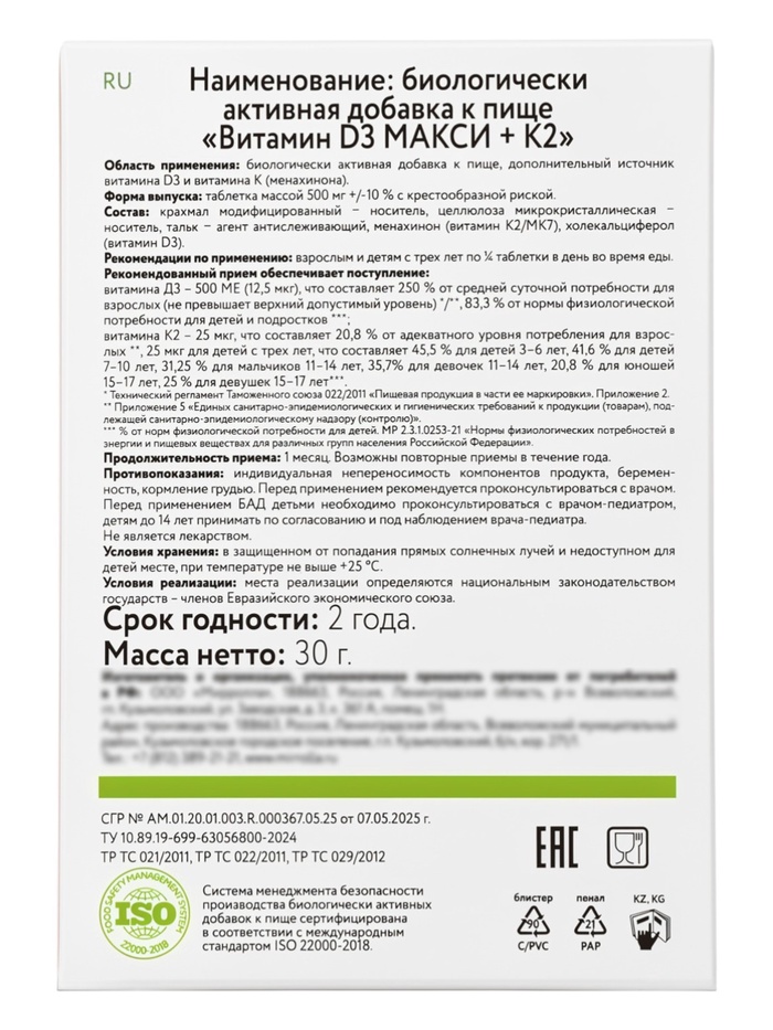 Состав: крахмал, микрокристаллическая целлюлоза, тальк, менахинон (витамин К2), холекальциферол (Витамин D3).