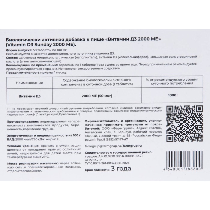 Биологически активная добавка к пище Витамин Д3 2000 МЕ. Рекомендуется в качестве биологически активной добавки к пище - источника витамина Д3. Витамин Д3 (холекальциферол) - биодоступная и эффективная форма витамина Д3, принимающая участие в деятельности практически всех органов и систем человеческого организма. Витамин D3 2000 МЕ, масло растительное (подсолнечное, рапсовое); оболочка капсулы: желатин пищевой, глицерин (влагоудерживающий агент), лимонная кислота (антиокислитель). Противопоказания: Индивидуальная непереносимость компонентов, беременность, кормление грудью.