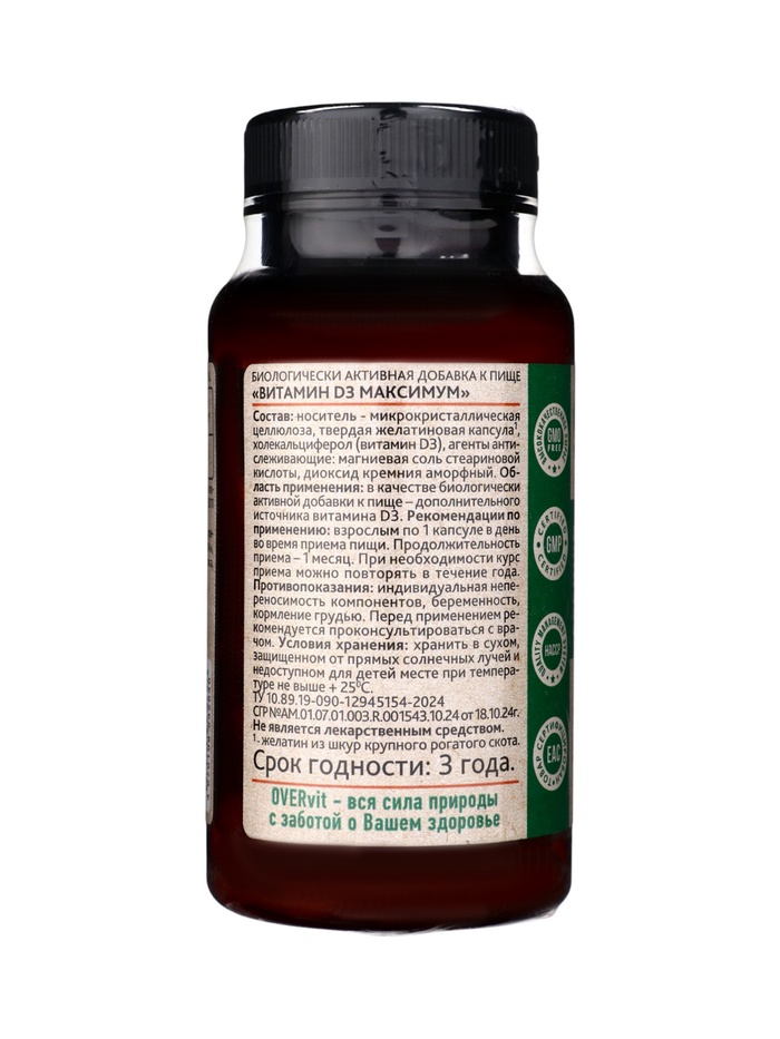 Витамин D3 максимум OVERvit, 60 капсул — это высококонцентрированный комплекс витамина D3, разработанный для поддержания здоровья костей, зубов и иммунной системы. Препарат способствует нормализации обмена кальция и фосфора, поддерживает оптимальный уровень витамина D в организме и улучшает работу сердечно-сосудистой и нервной систем. Комплекс особенно актуален для людей с дефицитом солнечного света, в зимний период и при повышенных физических нагрузках.