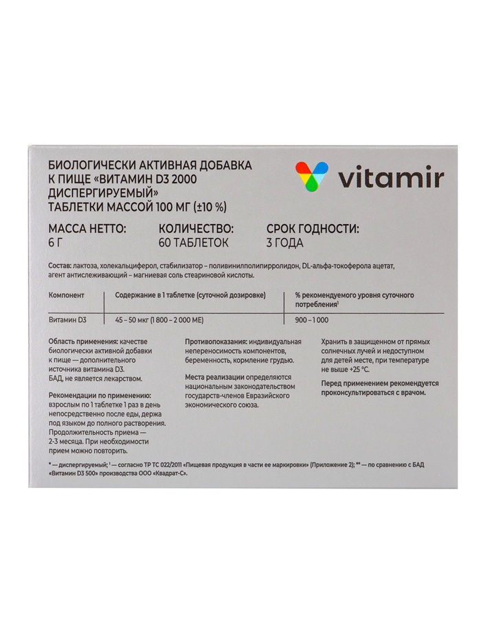 Витамин D3 диспергируемый 2000 МЕ «Витамир» TETRALAB — надёжная поддержка иммунитета, костей и зубов. Подходит для регулярного применения, способствует укреплению организма, поддержанию обменных процессов и сохранению здоровья на всех уровнях.