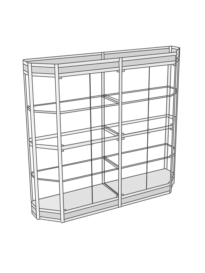 В комплект витрины входят 3 стеклянные полки в каждом отсеке. Задняя стенка выполнена из стекла. Его можно заменить на ДВП или зеркало. На дверцах есть замки. В верхней части расположена подсветка (точечные светильники). Высота фриза составляет 150 мм, высота подиума — 150 мм.