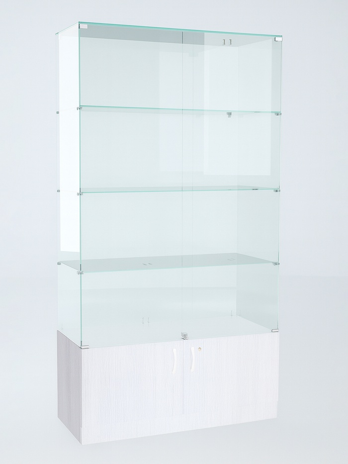 Витрина стеклянная с дверками, крыша стекло, в комплекте замки на дверках. Боковые стенки - стекло 5 мм, полки - стекло 5 мм, накопитель с двумя дверками - ЛДСП 500 мм.
