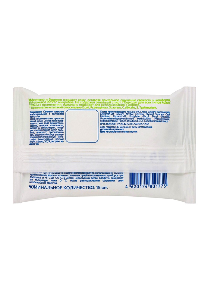 Компактные влажные салфетки ANTIBACTERIAL PROTECTION с экстрактом зелёного чая обеспечивают эффективное очищение и помогают снизить количество бактерий на коже и поверхностях. Экстракт зелёного чая известен своими антиоксидантными и освежающими свойствами, поэтому салфетки не только очищают, но и ухаживают за кожей, оставляя её мягкой и увлажнённой.