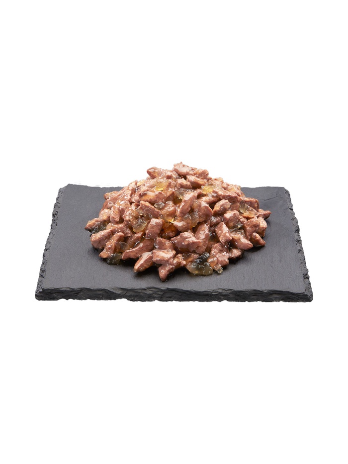 Мясные кусочки (лосось 32%, курица, говядина, плазма крови, минеральные вещества, витамины, мякоть сахарной свеклы, таурин) и желе (вода, аминокислоты, загустители, сахара).
