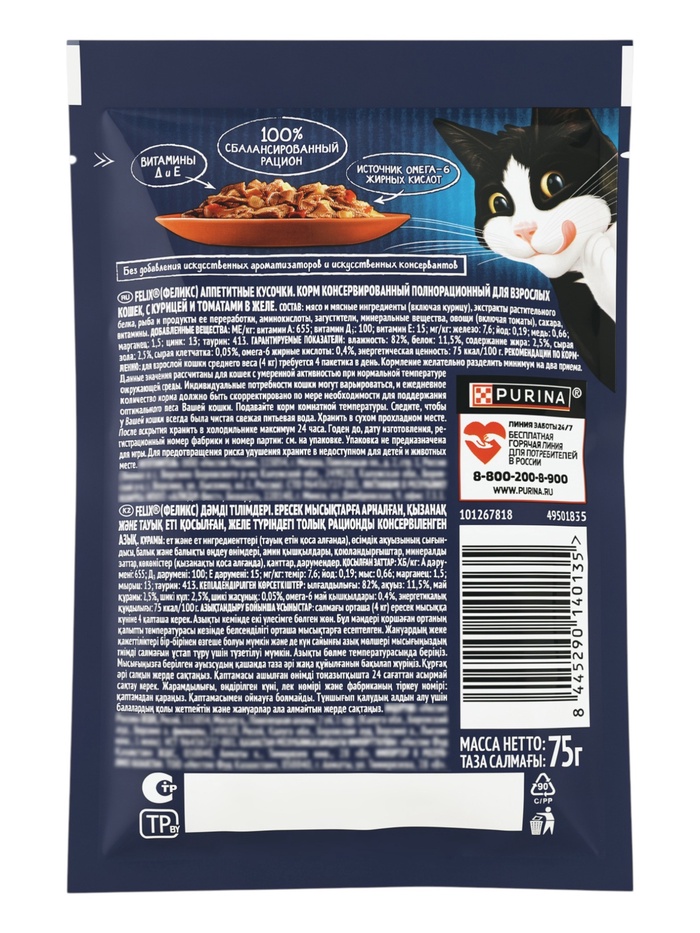 FELIX® Аппетитные кусочки — это совершенно особенный корм. У него такой аппетитный вид и аромат, словно Вы приготовили его сами. Каждый пакетик содержит нежные кусочки с овощами в сочном желе — вкуснятину, от которой кота за уши не оттащишь. Они такие же аппетитные на вкус, как и на вид! Корм является источником необходимых Омега 6 жирных кислот с правильным сочетанием минеральных веществ и витаминов, чтобы полностью удовлетворить ежедневные потребности Вашей кошки.