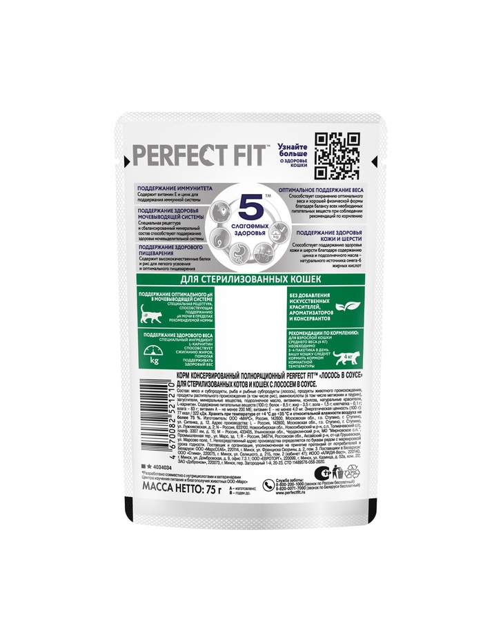 Влажный корм для стерилизованных кошек Perfect Fit, 75 г, лосось в соусе, пауч