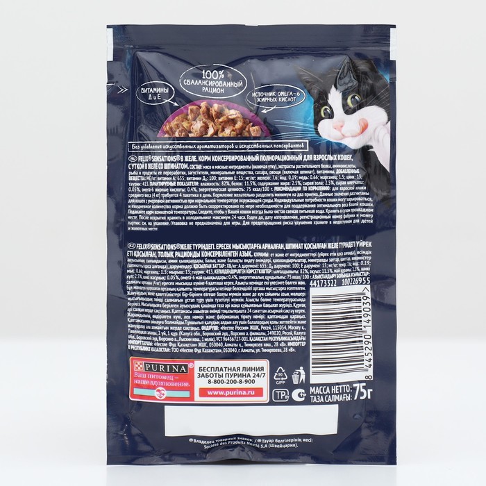 Состав: мясо и продукты переработки мяса (19 %, из которых утка 4%), экстракт растительного белка, рыба и рыбные субпродукты, овощи (шпинат 4 % в желе), минеральные вещества, сахара, витамины