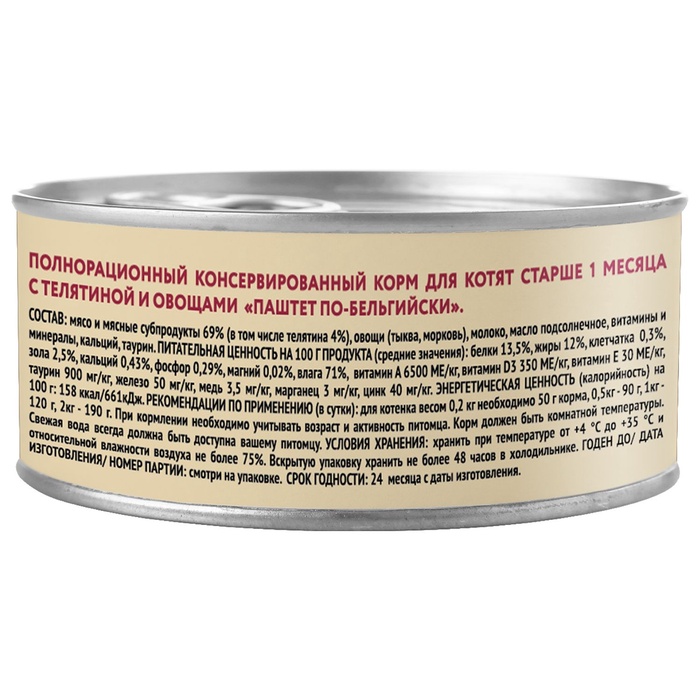 Первый вкус — должен быть нежным, но насыщенным. Влажный паштет для котят с телятиной и овощами — полноценный рацион в жестяной банке 100 г, разработанный как основное питание для котят от 1 месяца. Подходит всем породам на этапе перехода с молока к твердой пище.