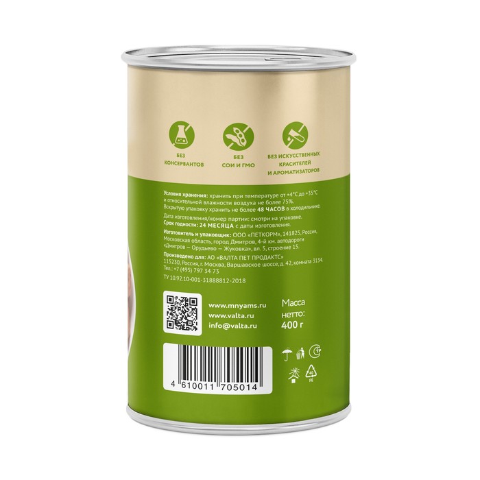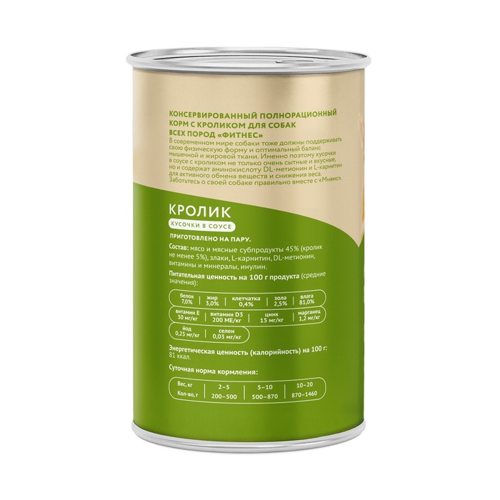 В современном мире собаки тоже должны поддерживать свою физическую форму и оптимальный баланс мышечной и жировой ткани. Именно поэтому кусочки в соусе с кроликом не только очень сытные и вкусные, но и содержат аминокислоты L-carnitine и DL-метионин для активного обмена веществ и снижения веса. Заботьтесь о своей собаке правильно вместе с «Мнямс». Приготовлено на пару. Без искусственных красителей и ароматизаторов. Без сои и гмо. Без консервантов. L-carnitine – для снижения веса. DL-метионин – для активного обмена веществ.