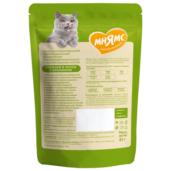 Влажный корм Мнямс На каждый день Кусочки в соусе с кроликом для стерилизованных кошек 85 г