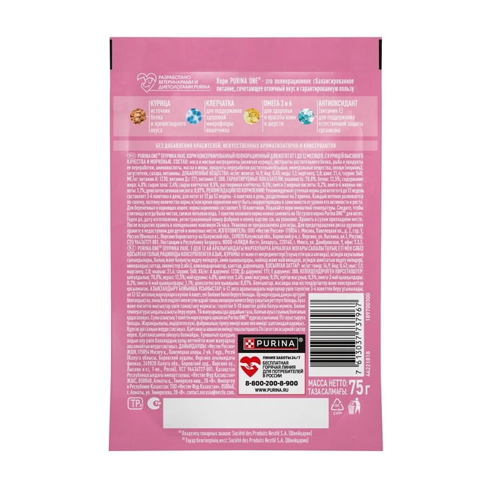 Создавая влажные корма для кошек, эксперты Purina разработали специальный рацион Purina One для котят 1-12 месяцев, который поможет заложить основы здоровья на всю жизнь.