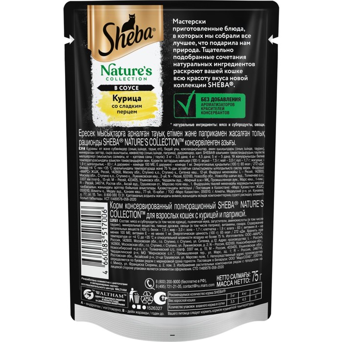 Состав: мясо и субпродукты (в том числе курица), пшеничная мука, загустители, аминокислоты (в том числе таурин), минеральные вещества, пивные дрожжи, овощи (в том числе паприка), витамины, сахара.