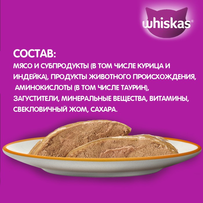 Это сбалансированный рацион, приготовленный именно так, как любит ваша кошка. Аппетитный паштет с курицей и индейкой подарит вашей любимице настоящее удовольствие. Жизнь замурррчательна, ведь рацион Whiskas® содержит все необходимое, чтобы еда вашей кошки была не только вкусной, но и полезной. Whiskas® поддержит иммунитет, позаботится о здоровом пищеварении и здоровье кожи и шерсти вашей кошки.