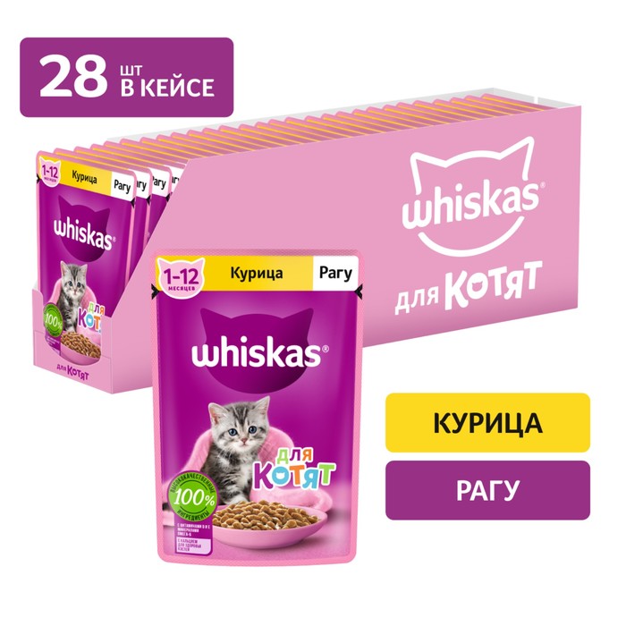 Рацион Whiskas® для котят ""Рагу с курицей"" — это сбалансированный рацион для здорового роста вашего малыша. Котенок с удовольствием попробует маленькие нежные кусочки с курицей в ароматном соусе. Все для замурррчательной жизни! Рационы Whiskas® для котят позаботятся об иммунитете, поддержат здоровое пищеварение и обеспечат здоровый рост и развитие. Котята активно растут и с первых дней нуждаются в правильном питании.