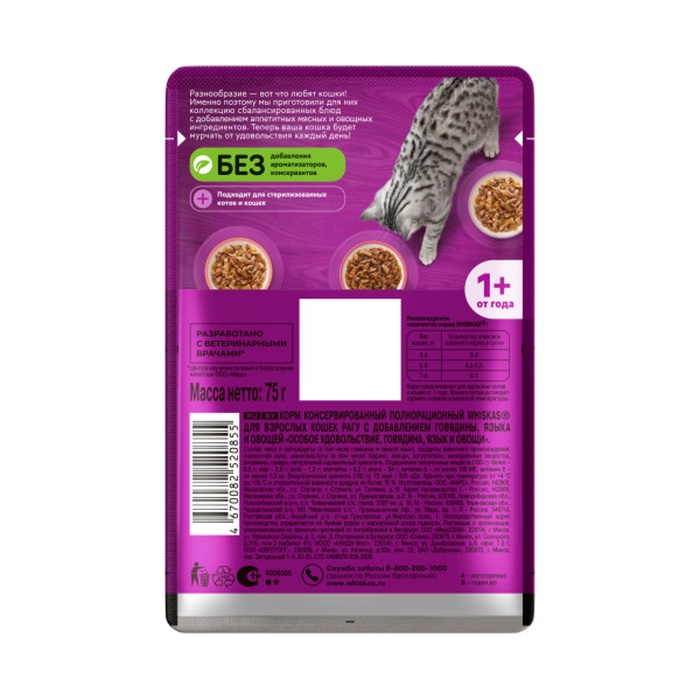 Сытное рагу с говядиной для привередливых питомцев! Влажный корм Whiskas® «Мясное рагу с говядиной и языком» — это полнорационное блюдо с кусочками мяса и овощами. Оно создано, чтобы разнообразить рацион взрослой кошки и обеспечить её всем необходимым.