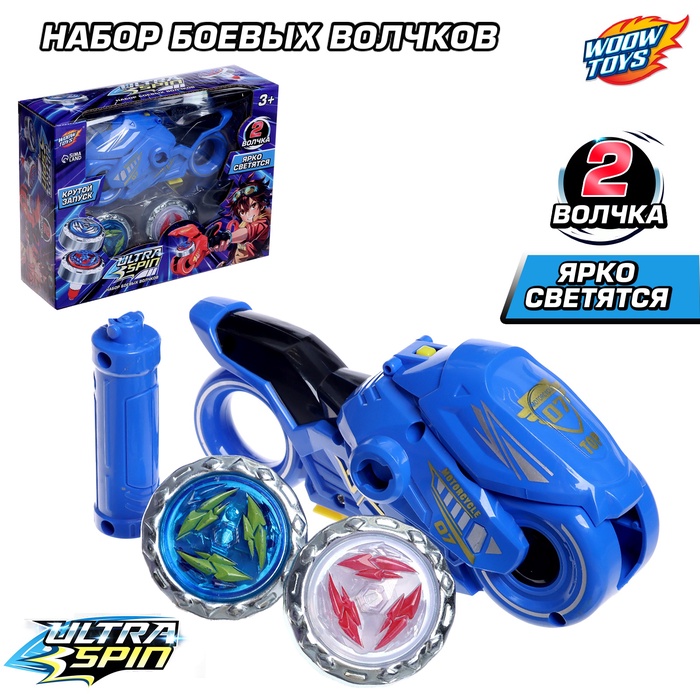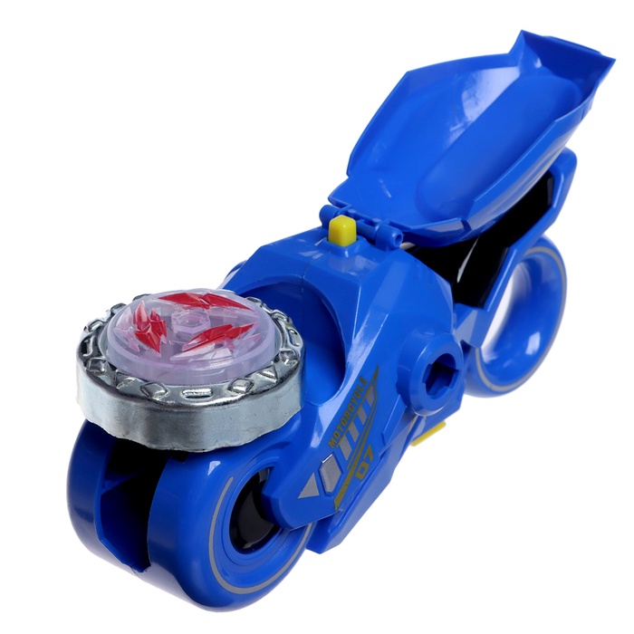 - Включает 2 ярких волчка и устройство для запуска в виде мотоцикла.