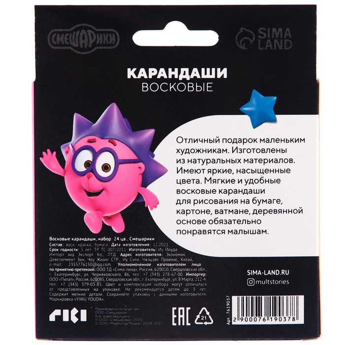Каждый карандаш завернут в бумажную этикетку с героем мультфильма, что предохраняет от загрязнений, снижает скольжение, увеличивает прочность. Восковые карандаши упакованы в картонную коробку с европодвесом.