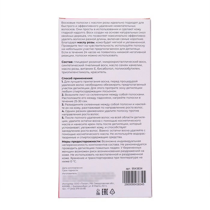 Восковые полоски с маслом розы идеально подходят для быстрого и эффективного удаления нежелательных волосков на любом участке тела. Они просты в использовании и сделают кожу гладкой надолго. Воск создан на основе натуральных смол хвойных дереьев, что позволяет максимально эффективно удалять волоски разной длины, включая самые короткие. Благодаря экстракту масла розы и витамина Е, кожа будет мягкой и увлажненной. Проведите тест на чувствительность: используйте полоску на небольшом участке предполагаемом для депиляци. Если в течение 24 часов не появилось никакой негативной реакции, полоски можно использовать.