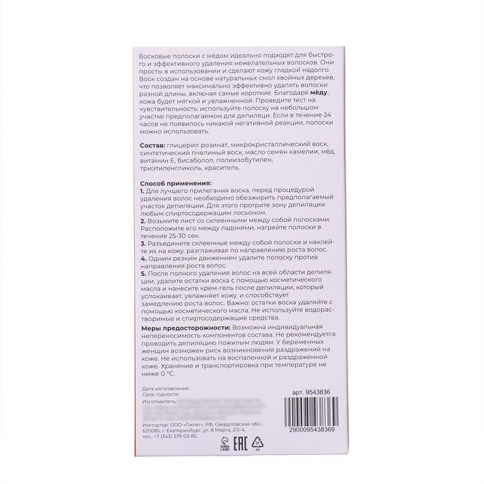 Восковые полоски с мёдом идеально подходят для быстрого и эффективного удаления нежелательных волосков на любом участке тела. Они просты в использовании и сделают кожу гладкой надолго. Воск создан на основе натуральных смол хвойных дереьев, что позволяет максимально эффективно удалять волоски разной длины, включая самые короткие. Благодаря мёду и витамина Е, кожа будет мягкой и увлажненной. Проведите тест на чувствительность: используйте полоску на небольшом участке предполагаемом для депиляци. Если в течение 24 часов не появилось никакой негативной реакции, полоски можно использовать.